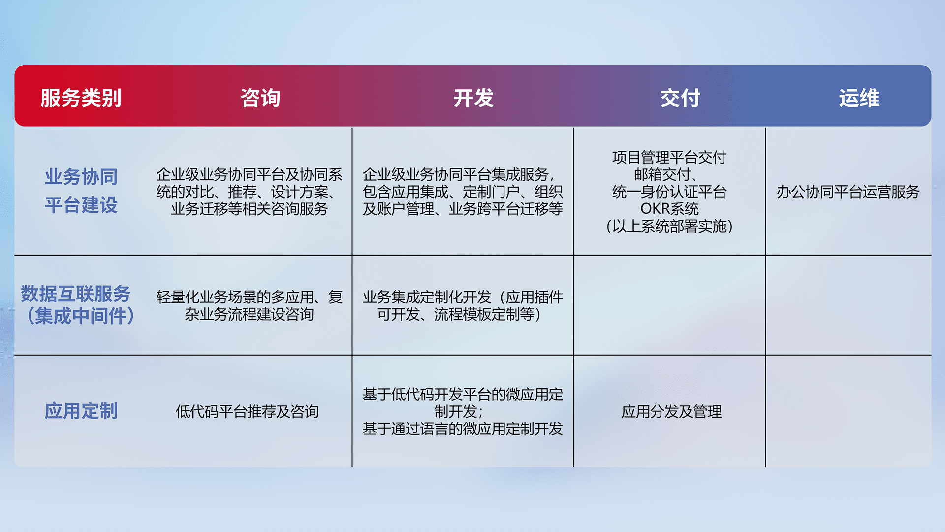 针对钉钉、、、企微、、、IDaas等平台级产品提供产品的规划、、方案、、、、交付、、、定制化开发等服务,,实现如统一协同办公、、、智能客户服务、、、混合会议管理、、智能数据查询、、等业务场景,,,,实现数字化转型。。